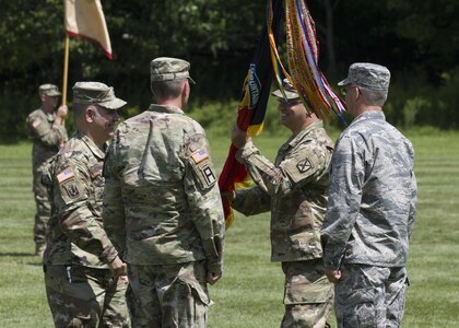 JERICHO, Vt. - U.S. Army Col. Andrew Harris, outgoing commander, 86th Infantry Brigade Combat Team (Mountain), accepts the unit colors from Command Sgt. Maj. Paul Edwards, 86th Infantry Brigade Combat Team (Mountain), during the brigade’s change of commander ceremony, Camp Ethan Allen Training Site, Jericho, Vt., Aug 13, 2017. Outgoing commander Col. Andrew Harris relinquished command to incoming commander Col. Nathan Lord during the ceremony. (U.S. Army National Guard Photo by Staff Sgt. Nathan Rivard)