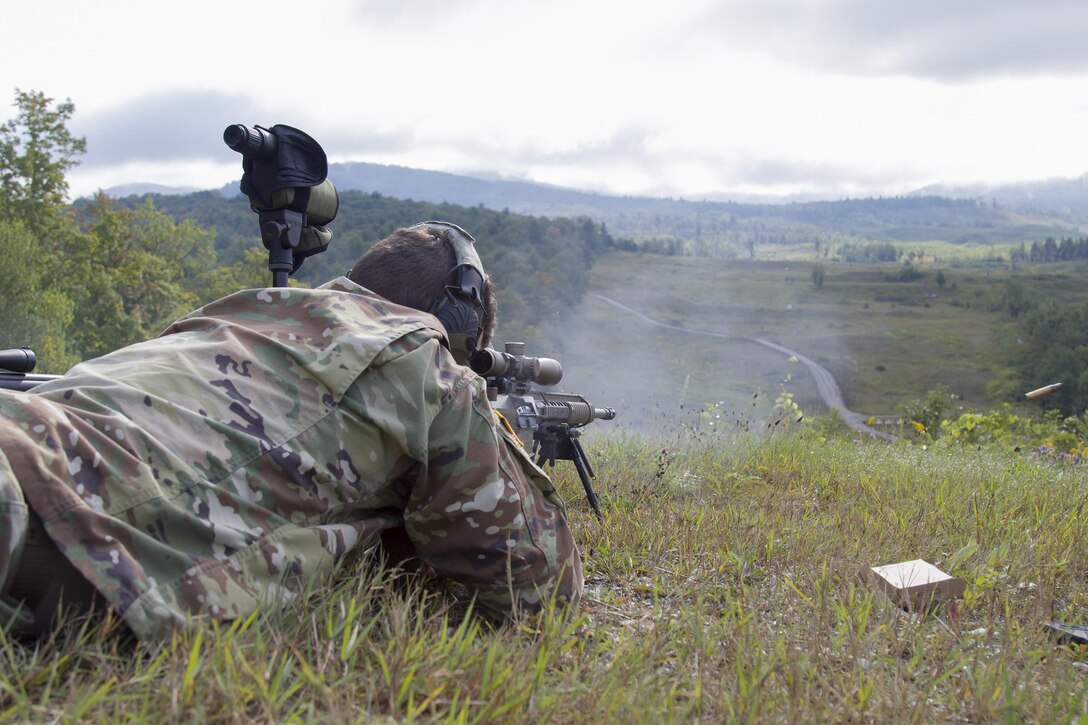 U.S. Army Sgt. Stephen Trombly, Headquarters Headquarters Company, 3rd Battalion, 172nd Infantry Regiment, 86th Infantry Brigade Combat Team (Mountain), Vermont National Guard, fires an M110 Semi-Automatic Sniper System during a sniper competition at Camp Ethan Allen Training Site, Jericho, Vt., Sept. 10, 2017. Vermont National Guard service members participated in the Vermont Adjutant General’s Combat Marksmanship Competition to challenge themselves and their marksmanship skills. (U.S. Army National Guard photo by Spc. Avery Cunningham)