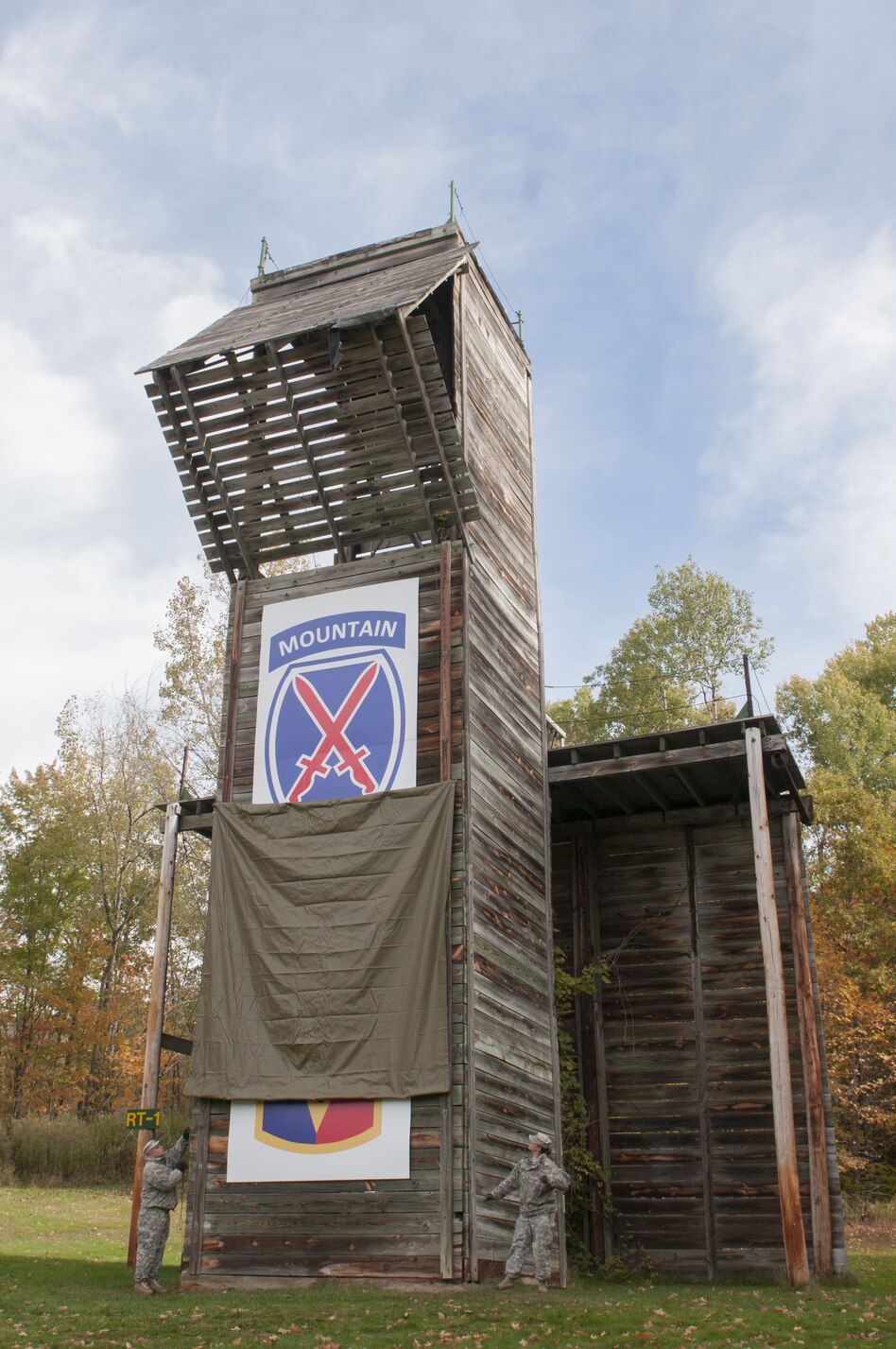 The 10th Mountain Division (Light Infantry) insignia is unveiled to the Soldiers of the 86th Infantry Brigade Combat Team (Mountain), during a re-patching ceremony, at Camp Ethan Allen Training Site, Jericho, Vt., Oct. 15, 2016. The brigade is participating in the Associated Units Pilot Program and donned the 10th Mountain Division patch as a symbol of their new alignment. (U.S. Army National Guard photo by Spc. Avery Cunningham)