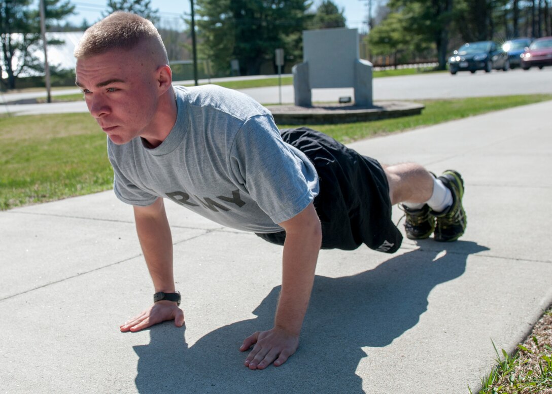 A U.S. Army Soldier with the Recruit Sustainment Company, Vermont Army National Guard, performs the push-up event of the Army Physical Fitness Test during drill at Camp Ethan Allen Training Site, Jericho, Vt., April 23, 2016. Soldiers in blue phase, those about to ship, are required to perform an APFT to measure their fitness. (U.S. Army National Guard Photo by Spc. Avery Cunningham)