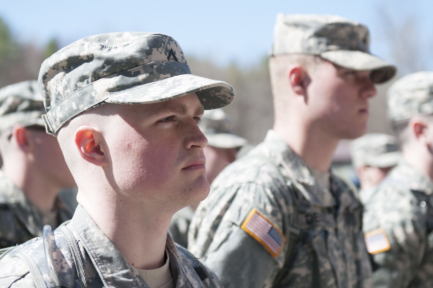 U.S. Army Pvt. Hunter Brouillette, Recruit Sustainment Company, Vermont Army National Guard, stands at parade rest during drill and ceremony practice at Camp Ethan Allen Training Site, Jericho, Vt., April 23, 2016. Soldiers perform a multitude of basic Soldier tasks while drilling with the Recruit Sustainment Company. (U.S. Army National Guard Photo by Spc. Avery Cunningham)