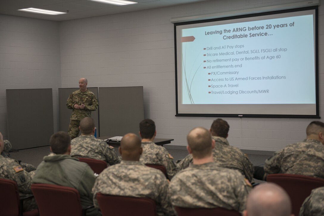 Sgt. 1st. Class David Pacheco, Vermont National Guard enlisted personnel manager, briefs Soldiers during the Crossroads event in Northfield, Vt., Jan. 9, 2016. The Crossroads event informs Soldiers who are within 90 days of ETS about benefits and opportunities available to them whether they are extending or retiring. (U.S. Army National Guard Photo by Staff Sgt. Nathan Rivard)