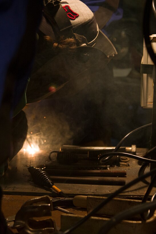 Hunter Britch, a student at Missisquoi Valley Union High School, Agriculture Science & Technology, welds at the Vermont Technical College Auto and Diesel Facility in Randolph, Vt., March 16, 2018. The event was hosted by VTC and the Vermont National Guard, and allows students to see the skill trades opportunities in the National Guard and use equipment from the National Guard. (U.S. Army National Guard photo by Sgt. Avery Cunningham)