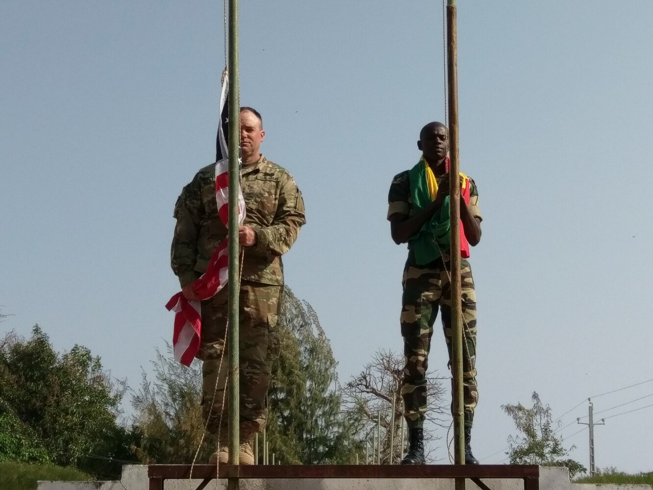 Sgt. Jack Curtis, horizontal construction engineer, Detachment 1, Garrison Support Command, prepares to raise the American Flag, during a ceremony honoring the partnership between the Vermont National Guard and Senegal, April 24, 2018, Centre D’Entrainment Tactique N7, Senegal. The Vermont National Guard and Senegalese Armed Forces engineers are renovating the firing range through their State Partnership Program relationship and marks the 10-year anniversary of their teamwork. (U.S. Army National Guard Photograph by Sgt. Jeremy Nadeau)