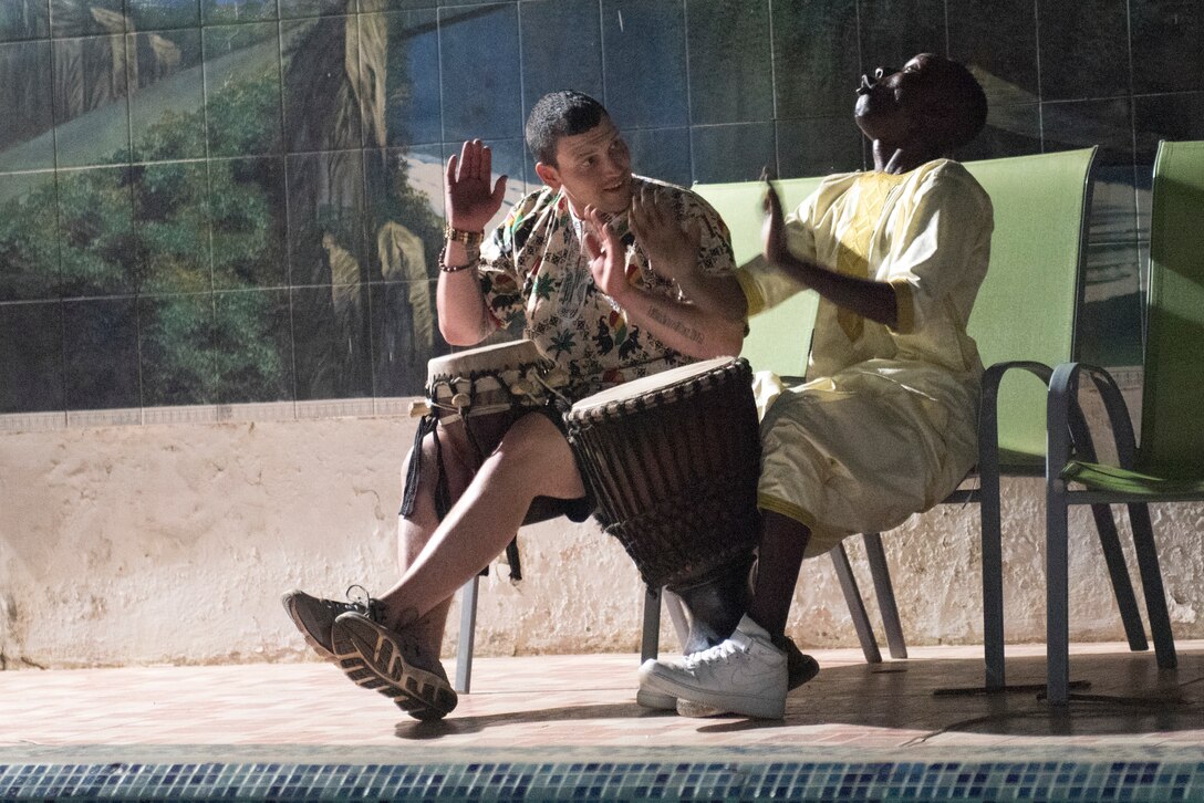 Sgt. James Hance, combat engineer, Bravo Company, 572nd Brigade Engineer Battalion, 86th Infantry Brigade Combat Team (Mountain), plays a drum with a local performer after the conclusion of range renovations, Mount Rolland Training Site; Senegal, April 18, 2018. The Vermont National Guard and Senegalese Armed Forces engineers are renovating the firing range through their State Partnership Program relationship and marks the 10-year anniversary of their teamwork. (U.S. Army National Guard Photograph by Officer Candidate Nathan Rivard)