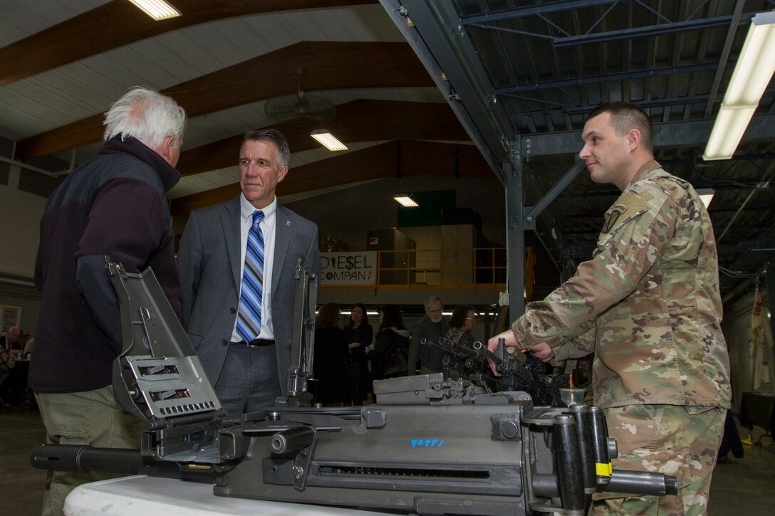 U.S. Army Staff Sgt. Josh Ainsworth, supply sergeant, Delta Company, 186th Brigade Support Battalion, 86th Infantry Brigade Combat Team (Mountain), Vermont National Guard, displays some of the gear used by the guard to Phil Scott, governor of Vermont, and other visitors at the armory in Swanton, Vt., April 12, 2018. The governor of Vermont, Phil Scott, declared April 12th as Cpl. Leonard A. Lord Day in Vermont in honor of the 100th anniversary of his death. (U.S. Army National Guard photo by Sgt. Avery Cunningham)