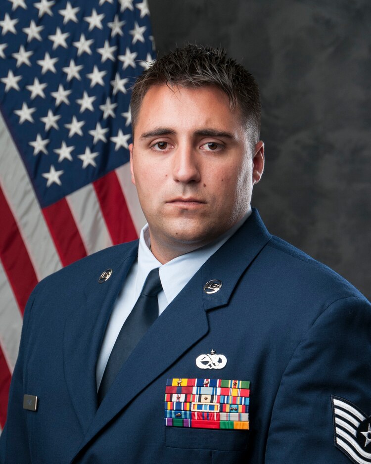 Tech. Sgt. Matt Dykas, low observable aircraft structural maintenance specialist, 158th Fighter Wing, poses for an official photo.