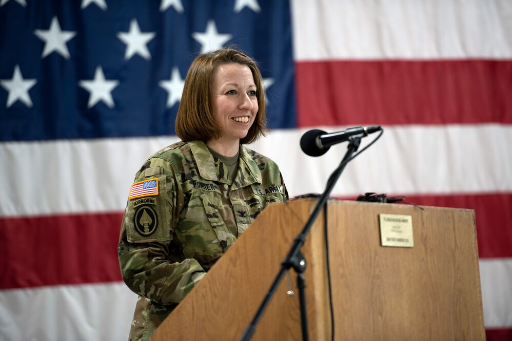 U.S. Army Col. Tracey Poirier, commander, 124th Regiment (Regional Training Institute), Vermont National Guard, speaks during a change of command ceremony at Camp Johnson, Colchester, Vt., April 7, 2019. Poirier recently returned from a deployment to Iraq, where she served as the chief of staff for Joint Special Operations Command. (U.S. Air National Guard photo by Master Sgt. Sarah Mattison)