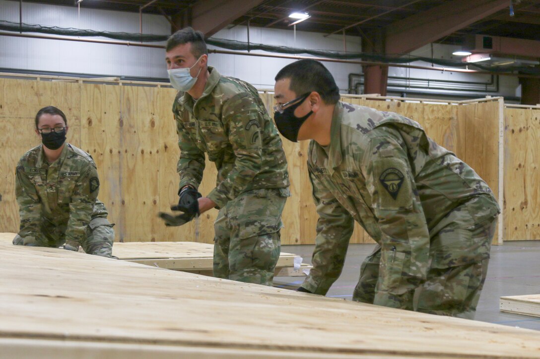 Soldiers and Airmen assigned to the Vermont National Guard's COVID-19 response reconstruct the Alternate Healthcare Facility at the Champlain Valley Fairgrounds in Essex Junction, Vermont, Nov. 19, 2020. The AHF was originally constructed in April, but was disassembled in July after seeing little use. The Vermont National Guard is reusing the materials from the earlier project to construct this smaller facility, which will remain locked until the the Vermont Department of Health determines it is needed. It can accommodate up to 200 patients if needed.