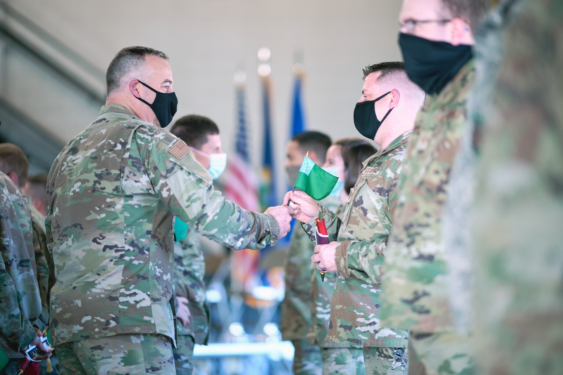 Col. Adam Rice, vice wing commander of the 158th Fighter Wing, Vermont Air National Guard, and Command Chief Master Sgt. Jeffery Stebbins, wing command chief, present Second Vermont Republic flags to Airmen preparing to deploy during a ceremony at Vermont Air National Guard Base Nov. 8, 2020. Family members and friends attended the socially distanced event, with three held to comply with all COVID-19 precautions.