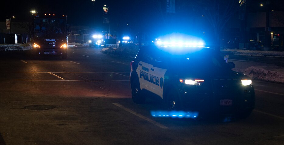 A bus carrying Soldiers with the Vermont National Guard's 172nd Law Enforcement Detachment arrives at Burlington International Airport in South Burlington, Vermont, with a local police escort Jan. 26, 2021. The Soldiers will travel to Fort Bliss, Texas, for processing and skill evaluations before deploying to support Operation Freedom's Sentinel in Europe.
