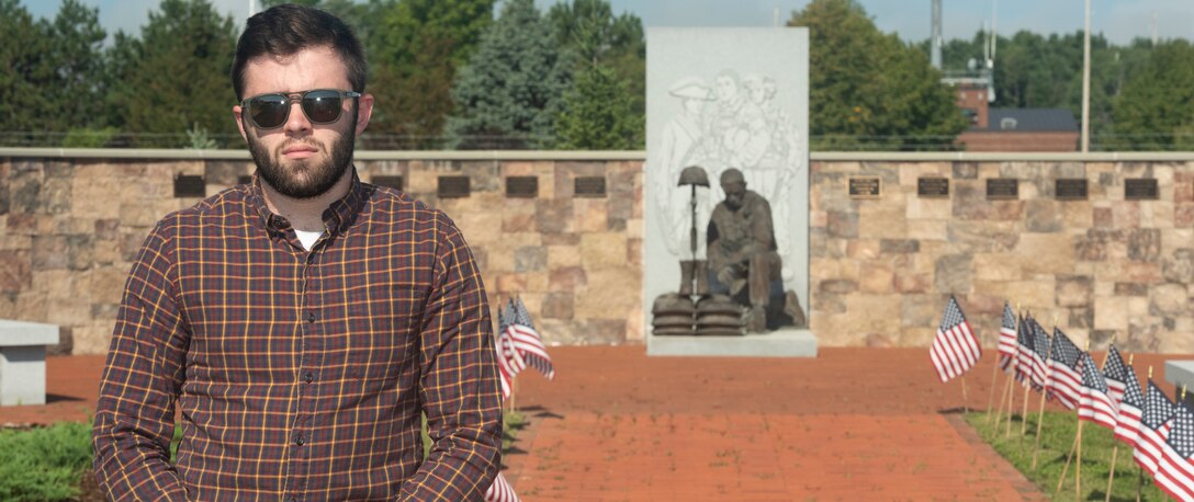John Brutzman, the substance abuse prevention coordinator for the Vermont National Guard, stands in front of the Fallen Heroes Memorial at Camp Johnson, Vermont, on Sept. 8, 2022. The 22 flags at the memorial represent the approximately 22 veterans lost to suicide every day. Brutzman, a native of Montclair, New Jersey, also serves as a suicide prevention coordinator as needed. (U.S. Army National Guard photo by Don Branum)