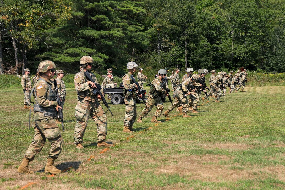 Vermont Army National Guard Soldiers and Airmen begin running towards the firing line during the 2022 Adjutant General's Combat Marksmenship Competition. The competitors must sprint 100 yards to the firing line to elevate their heart rates before firing at a 12 inch target from 200 yards. (U.S. Army National Guard photo by Sgt. 1st Class Jason Alvarez)