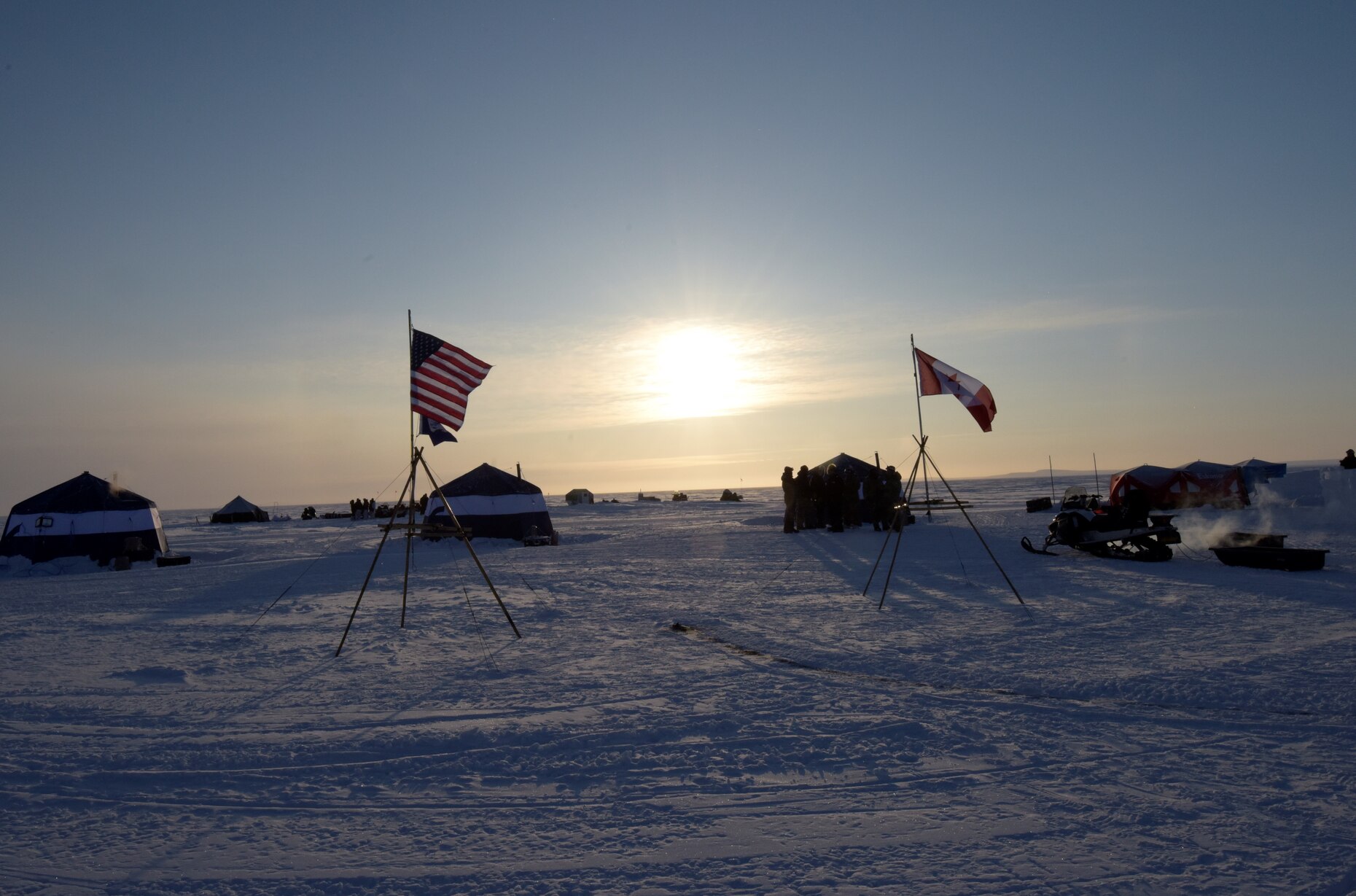 The U.S. and Canadian flags fly over Camp Wilbur, a camp established by members of the 109th Airlift Wing, New York Air National Guard. Camp Wilbur was the location where U.S. Army and Canadian Soldiers practiced and conducted tactical insertion on an open ice skiway delivered by an LC-130 Hercules skiplane on frozen oceanic Arctic ice near Cornwallis Island, Nunavut, Canada, March 15, 2023.